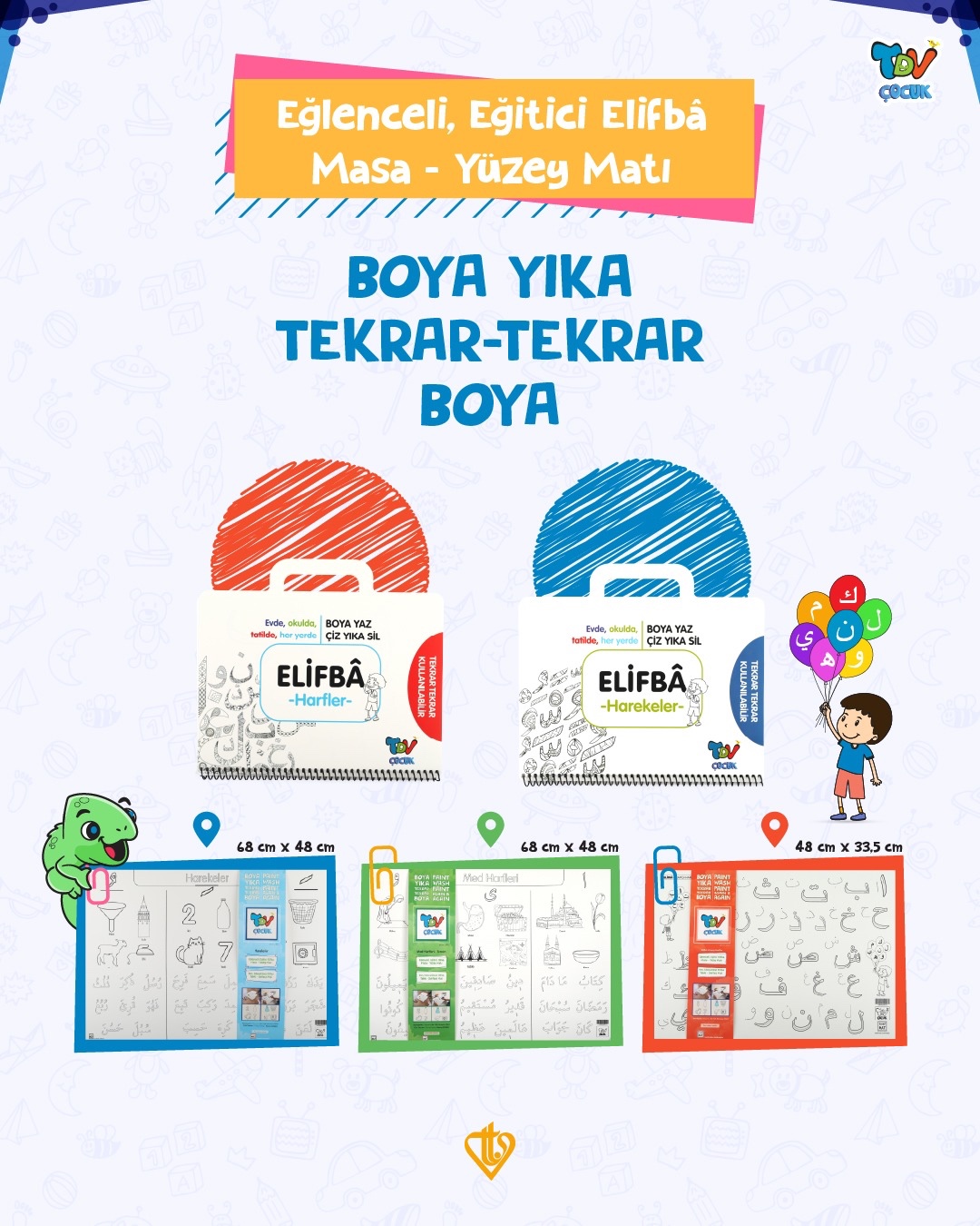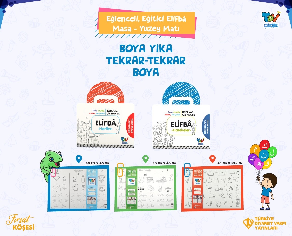 Yıkanabilir elif ba harfleri bulunan orta boy yüzey matı ise eğlenceli figürler eşliğinde çocukların evlerinde nitelikli zaman geçirmesini hedefliyor.