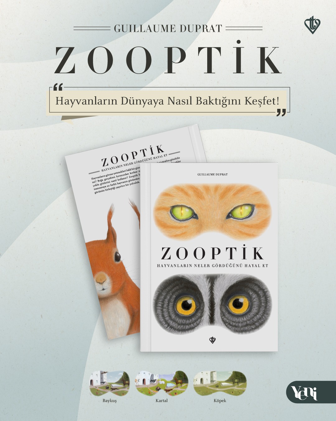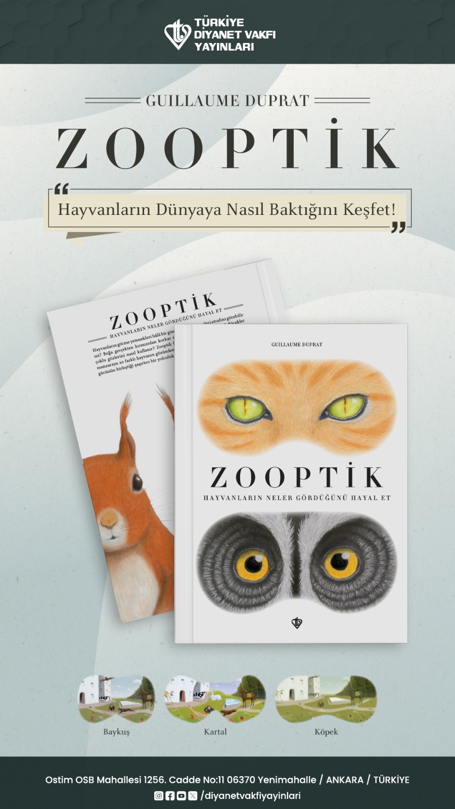 Hayvanların görme yeteneklerini ve dünyayı nasıl algıladıklarını çocukların dünyasına hitap eden bir anlayışla işleyen “Zooptik”, Türkiye Diyanet Vakfı Yayınları arasında yerini aldı. Çocuk kitapları ile tanınan çağdaş Fransız yazar Guıllaume Duprat’ın kaleme aldığı bu interaktif eser, çocuklara eğlenerek öğrenme imkânı sunuyor.