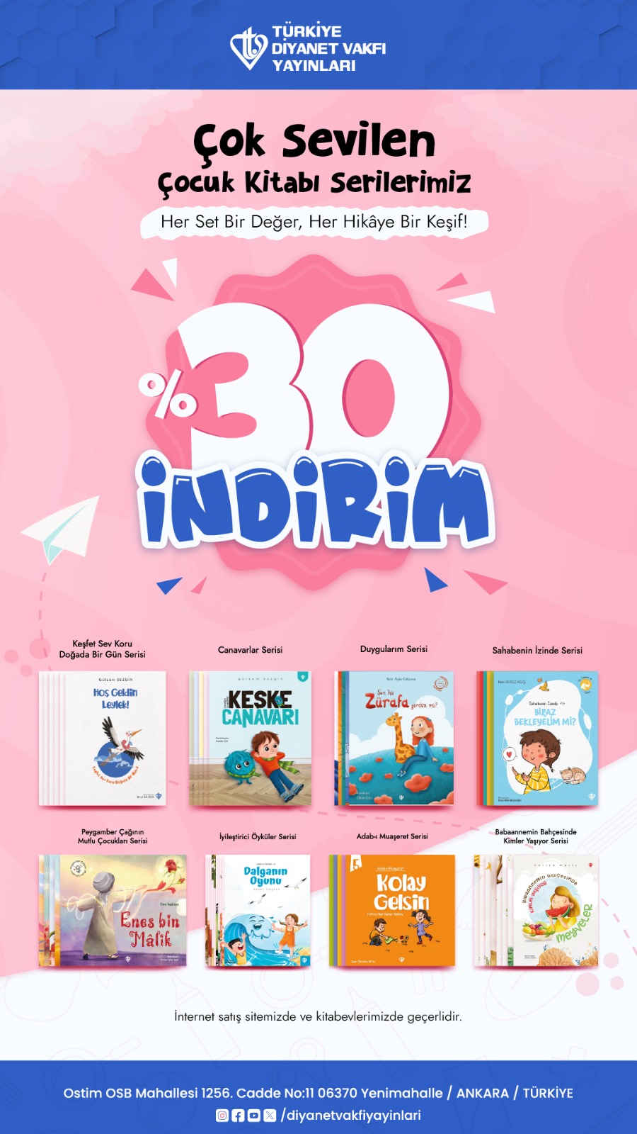 İslam kitapları ve hediyelik ürünleriyle olduğu kadar çocuk kitapları ve genç kitapları serileri ile geniş bir külliyat oluşturan Türkiye Diyanet Vakfı Yayınları’nda bu serilere %30 indirim tanımlanmış. Siz de çocuk kitapları serilerini yakından incelemek ve satın almak için TDV e-satış sitesi ve TDV Kitabevlerini ziyaret edebilirsiniz.